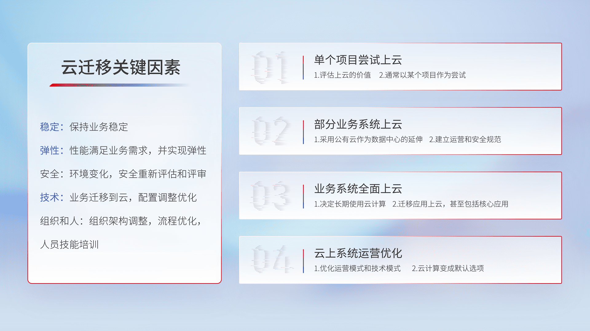 结合实际业务,,,,从规划设计、、、、云平台选型、、云原生改造、、、、数据迁移、、、、集成交付,,,,迁移全过程为客户识别最佳上云路径,,做好风险识别管理,,,,设计网络架构、、、、身份权限、、安全审计合规、、、操作审计、、、、日志审计、、、监控告警策略、、、、多站点容灾设计等,,,对云上基础设施进行整体规划,,提升IT治理水平,,以满足弹性、、高可用、、、、高性能的需求。。